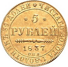 Los-Nummer: Auktion 51 - 3800 Ausländische Münzen und Medaillen Russland Nikolaus I. 1825-1855, 5 Rubel 1837, St. Petersburg. Münzmeister Paul Danilov. Harris 346, Friedberg 155, Bitkin 14 (R1). GOLD. Sehr seltener Jahrgang. Randfehler, sehr schön - vorzüglich Schätzpreis: 2000,- Zuschlag: unverkauft |