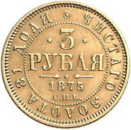 Los-Nummer: Auktion 51 - 3824 Ausländische Münzen und Medaillen Russland Alexander II. 1855-1881, 3 Rubel 1875, St. Petersburg. Münzmeister Nikolai Iossa. Harris 404, Friedberg 164, Bitkin 37. GOLD. Sehr schön - vorzüglich Schätzpreis: 750,- Zuschlag: Z |