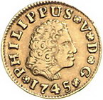 Los-Nummer: Auktion 51 - 4014 Ausländische Münzen und Medaillen Spanien Philipp V. 1700-1746, 1/2 Escudo 1742, 1745, Sevilla. Calicó/Trigo 511, 515, Friedberg 240 (2). 2 Stück. GOLD. Sehr schön Schätzpreis: 150,- Zuschlag: 330,- |