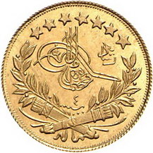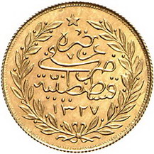 Los-Nummer: Auktion 51 - 4059 Ausländische Münzen und Medaillen Türkei Muhammad V. (AH -) 1909-1918, 100 Piaster AH 1327, Jahr 4. K.M. 754, Friedberg 52. GOLD. Prachtexemplar. Stempelglanz Schätzpreis: 250,- Zuschlag: Z |