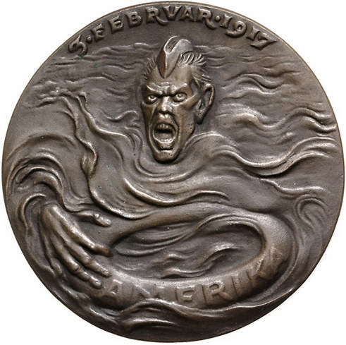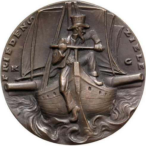 Los-Nummer: Auktion 51 - 2367 Medaillen Münchner Medailleure Goetz, Karl Bronzegussmedaille 1917. Auf die amerikanischen Friedensziele. Präsident Wilson sitzt auf Bug eines mit Kanonen aufgerüsteten Segelschiffes / Engländer greift nach Rettungsring mit Aufschrift: AMERIKA. Kienast 188. 57 mm. Vorzüglich Schätzpreis: 100,- Zuschlag: 250,- |