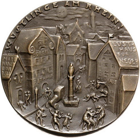 Los-Nummer: Auktion 51 - 2376 Medaillen Münchner Medailleure Goetz, Karl Bronzegussmedaille 1920. 'Wüstlinge am Rhein'. Wie vorher. Kienast 274. 58 mm. Vorzüglich Schätzpreis: 100,- Zuschlag: 90,- |