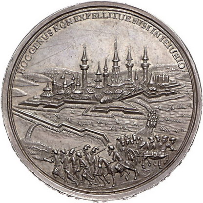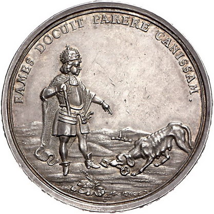 Los-Nummer: Auktion 51 - 2112 Haus Habsburg Haus Habsburg Leopold I. 1657-1705, Medaille 1690, von Färber. Auf die Eroberung von Kanischa. Stadtansicht, im Vordergrund abziehende Türken / Der junge König Joseph gebietet einer ausgemergelten Hündin, den Stadtschlüssel auf dem Boden abzulegen, im Hintergrund Landschaft. Slg. Montenuovo 1100 , Slg. Julius 368. 43 mm, 34,05 g. Mit Randschrift. Winz. Kratzer, vorzüglich Schätzpreis: 500,- Zuschlag: 750,- |