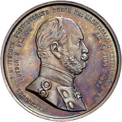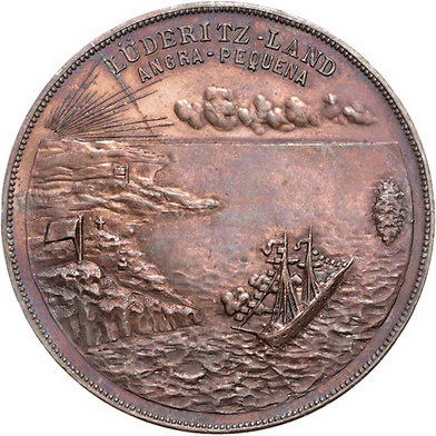 Los-Nummer: Auktion 51 - 2480 Medaillen Kolonien Bronzemedaille 1884, von Lauer. Auf die Verkündung des Deutschen Protektorates über Angra Pequena durch Dr. Nachtigall und der Entfaltung der Flagge. Brustbild Kaiser Wilhelms I. in Uniform nach rechts / Feuerndes Schiff vor Küste. Slg. Grönegreß 1266/67, Slg. Marienburg 10403. 40 mm. Winz. Stempelfehler, fast vorzüglich Schätzpreis: 100,- Zuschlag: 100,- |