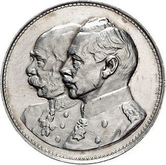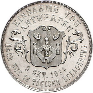 Los-Nummer: Auktion 51 - 2507 Medaillen Erster Weltkrieg Zwittermedaille 1914, von Drentwett. Die Brustbilder von Wilhelm II und Franz Joseph I. in Uniform nach links / Stadtwappen von Antwerpen. Zetzmann 4037. 33,5 mm, 14,65 g. Sehr schön - vorzüglich Schätzpreis: 100,- Zuschlag: 80,- |