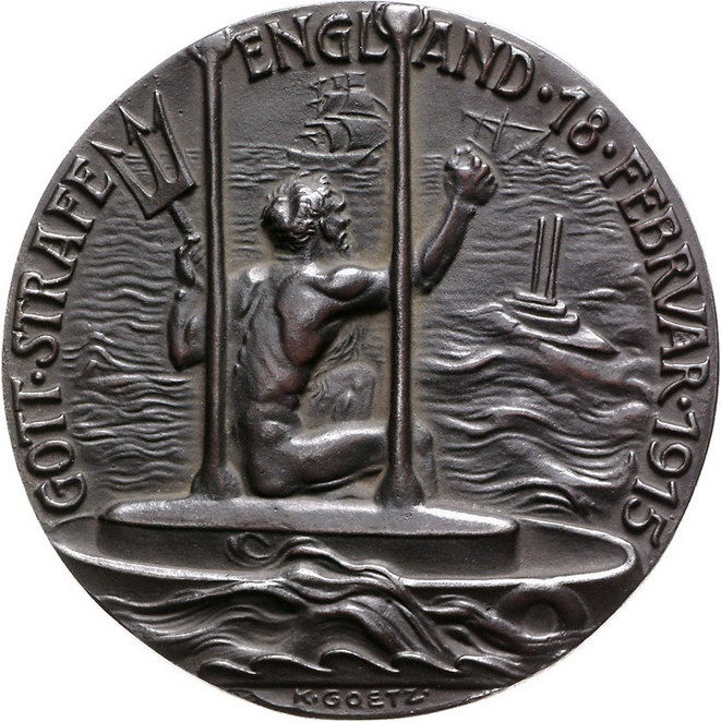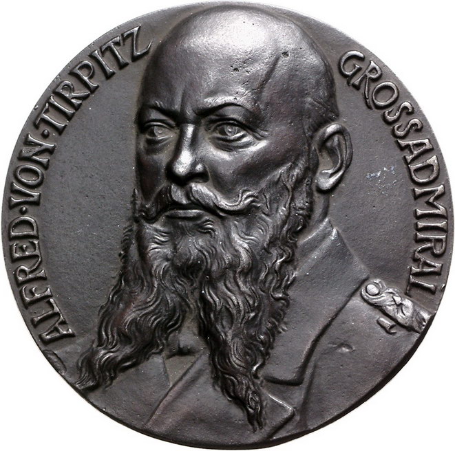 Los-Nummer: Auktion 51 - 2547 Medaillen Erster Weltkrieg Personenmedaillen Tirpitz, Admiral Alfred von *1849 Küstrin, +1930 Ebenhausen bei München, Bronzegussmedaille 1915. Auf den Beginn des U-Boot-Krieges. Brustbild des Großadmirals Alfred von Tirpitz halblinks / Auf U-Boot sitzender Neptun mit Dreispitz ballt die rechte Faust gegen die englische Flotte. 81 mm. Vorzüglich Schätzpreis: 125,- Zuschlag: 160,- |