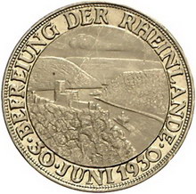Los-Nummer: Auktion 51 - 2553 Medaillen Weimarer Republik Goldmedaille in der Größe eines 20-Mark Stückes 1930. Auf die Rheinlandräumung. Kopf Hindenburgs nach links / Rheintal. 22,5 mm, 6,05 g. GOLD. Vorzüglich Schätzpreis: 150,- Zuschlag: 200,- |