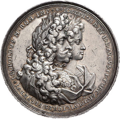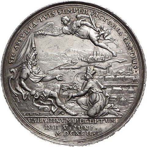 Los-Nummer: Auktion 51 - 2115 Haus Habsburg Haus Habsburg Leopold I. 1657-1705, Medaille 1692, von P.H. Müller. Auf die Eroberung von Peterwardein. Die Brustbilder Leopolds und Josefs nebeneinander nach rechts / Die Stadtgöttin überreicht dem thronenden und von Viktoria bekränztem Kaiser die Stadtschlüssel, im Hintergrund Stadtansicht. Slg. Montenuovo 1112 , Slg. Julius 376, Forster 677. 49,5 mm, 44,53 g. Mit Randschrift. Winz. Randfehler, sehr schön - vorzüglich Schätzpreis: 300,- Zuschlag: 270,- |