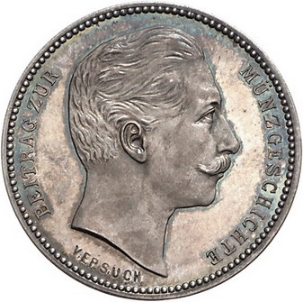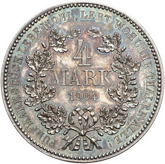 Los-Nummer: Auktion 51 - 2749 Proben Kaiserreich Preußen, 4 Mark 1904. Private Probe von H. Schmidt in der Prägeanstalt Drentwett in Augsburg. Unter dem Halsabschnitt graviert: VERSUCH. Schaaf 103 a/G3. Schöne Patina. Fast Stempelglanz Schätzpreis: 500,- Zuschlag: unverkauft |