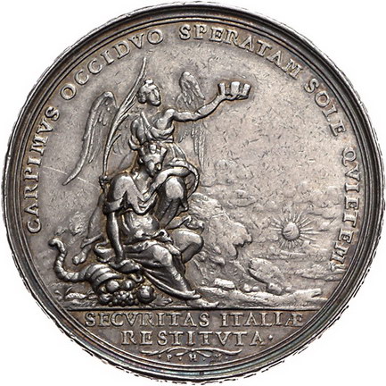 Los-Nummer: Auktion 51 - 2117 Haus Habsburg Haus Habsburg Leopold I. 1657-1705, Medaille 1695, von P.H. Müller und Kleinert. Auf die Eroberung von Casale durch Prinz Eugen. Italia mit Mauerkrone und Engel / Plan der Festung, davor Flussgott des Po mit Stierkopf. Slg. Montenuovo - , Slg. Julius 438 (Ag), Forster 692. 44 mm, 29,40 g. Sehr selten. Mit Randschrift. Randfehler, fast sehr schön Schätzpreis: 300,- Zuschlag: 240,- |