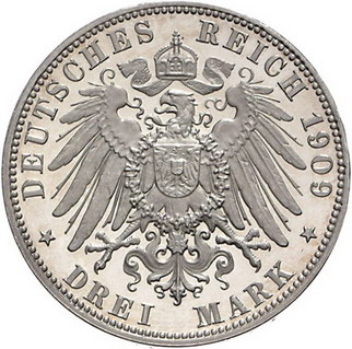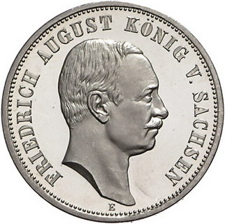 Los-Nummer: Auktion 51 - 2687 Münzen des Deutschen Kaiserreichs Sachsen Friedrich August III. 1904-1918, 3 Mark 1909 E. Jaeger 135. Polierte Platte. Minimal berieben, fast Stempelglanz Schätzpreis: 100,- Zuschlag: unverkauft |