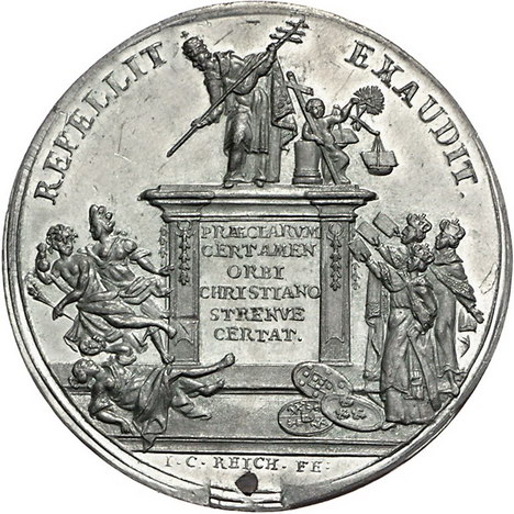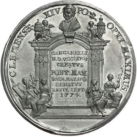 Los-Nummer: Auktion 51 - 188 Altdeutsche Münzen und Medaillen Brandenburg-Medaillen von Johann Christian Reich Zinnmedaille 1774. Auf den Tod von Papst Clemens XIV. Torbogen mit seiner Büste, darin Schrift, auf den Stufen sitzen vier Personen / Der Papst auf einem Postament stehend, daneben u.a. die Könige von Frankreich, Spanien und Portugal. Slg. Wilmersdörffer 1281 , Slg. Fieweger 693. 47,5 mm. Mit Kupferstift. Stempelglanz Schätzpreis: 125,- Zuschlag: 110,- |