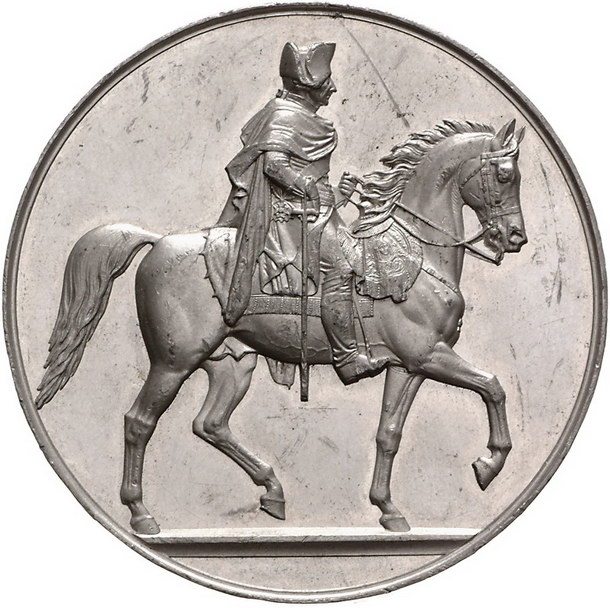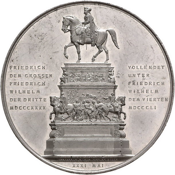 Los-Nummer: Auktion 51 - 561 Altdeutsche Münzen und Medaillen Brandenburg-Preußen Friedrich Wilhelm IV. 1840-1861, Zinnmedaille 1851, von Kullrich. Auf das Reiterdenkmal Friedrichs des Großen unter den Linden. Die Reiterstatue nach rechts / Das vollständige Denkmal, auf der Abschnittsleiste CHRISTIAN RAUCH INV. ET SCULP. Slg. Henckel 2599, Slg. Marienburg 4251 , Sommer K 4. 62 mm. Kratzer, vorzüglich Schätzpreis: 75,- Zuschlag: 125,- |