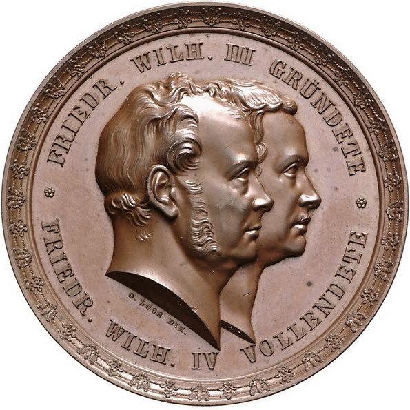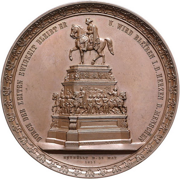 Los-Nummer: Auktion 51 - 560 Altdeutsche Münzen und Medaillen Brandenburg-Preußen Friedrich Wilhelm IV. 1840-1861, Bronzemedaille 1851, von Bubert. Auf die Enthüllung des Denkmals Friedrichs des Großen unter den Linden. Die Köpfe Friedrich Wilhelms III. und Friedrich Wilhelms IV. nebeneinander nach rechts / Ansicht des von Rauch geschaffenen Denkmals. Slg. Henckel 2597, Slg. Marienburg 4250. 60,5 mm. Winz. Randfehler, vorzüglich - Stempelglanz Schätzpreis: 100,- Zuschlag: 180,- |
