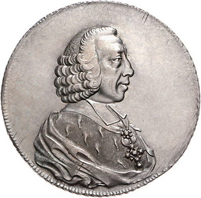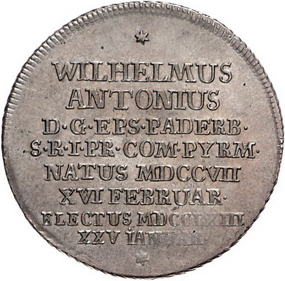 Los-Nummer: Auktion 51 - 1350 Altdeutsche Münzen und Medaillen Paderborn, Bistum Wilhelm Anton von Asseburg 1763-1782, Taler 1763, Neuhaus. Auf seine Wahl zum Bischof. Brustbild im Hermelin nach rechts / Acht Zeilen Schrift zwischen sechsstrahligen Sternen. Schwede 283, Weingärtner 268, Davenport 2946. 41 mm. #02 var, 43 mm Schwede 284} Kleine Prägeschwäche auf der Rückseite, vorzüglich - Stempelglanz Schätzpreis: 2500,- Zuschlag: unverkauft |