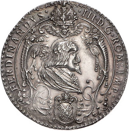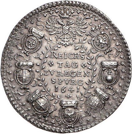 Los-Nummer: Auktion 51 - 1468 Altdeutsche Münzen und Medaillen Regensburg-Stadt Medaille 1641. Auf den Reichstag in Regensburg. Brustbild Ferdinands III. in gekrönter Einfassung / Schrift in Kranz, umgeben von einem gekrönten Doppeladler und den Wappen der sieben Kurfürsten. Dickabschlag im doppelten Gewicht. Plato 88. 43 mm, 36,74 g. Schöne Patina. Vorzüglich Schätzpreis: 900,- Zuschlag: 760,- |