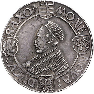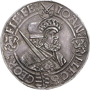Los-Nummer: Auktion 51 - 1525 Altdeutsche Münzen und Medaillen Sachsen-Kurfürstentum Johann der Beständige und Georg 1525-1530, Guldengroschen o.J., Annaberg. Münzzeichen Kleeblatt. Bärtiges Brustbild Johanns mit Pelzmütze und geschultertem Schwert / Brustbild Georgs mit Kappe und Mantel nach links. Keilitz 86, Slg. Merseburger 438, Schnee 51, Davenport 9717, Schulten 3040. Schöne Patina. Sehr schön - vorzüglich Schätzpreis: 1500,- Zuschlag: 1200,- |