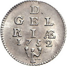 Los-Nummer: Auktion 51 - 3494 Ausländische Münzen und Medaillen Niederlande-Geldern, Provinz Silberabschlag von den Stempeln des Duits 1752. Verkade 19/6, K.M. 83 a, Purmer Ge 115.1 , CNM 1.12.152. 2,89 g. Vorzüglich - Stempelglanz Schätzpreis: 150,- Zuschlag: 190,- |
