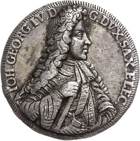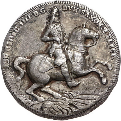 Los-Nummer: Auktion 51 - 1574 Altdeutsche Münzen und Medaillen Sachsen-Albertinische Linie Johann Georg IV. 1691-1694, Münzförmige Medaille o.J. Brustbild nach rechts / Nach rechts reitender Kurfürst. Slg. Merseburger - , Tentzel -, Dassdorf -, Slg. Engelhardt -. 47 mm, 39,20 g. Kratzer, fast sehr schön Schätzpreis: 500,- Zuschlag: unverkauft |