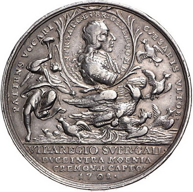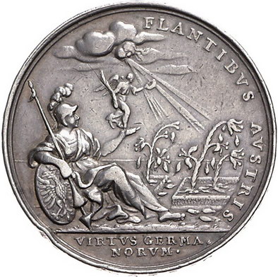 Los-Nummer: Auktion 51 - 2124 Haus Habsburg Haus Habsburg Leopold I. 1657-1705, Medaille 1702, von P.H. Müller. Auf die Einnahme von Cremona durch Prinz Eugen. Medaillonbildnis des Prinzen über Adler / Ruhende Germania mit Viktoria neben Lilien im Wind. Slg. Montenuovo 1166 , Slg. Julius 627, Forster 712. 40 mm, 29,78 g. Randfehler, sehr schön Schätzpreis: 150,- Zuschlag: unverkauft |