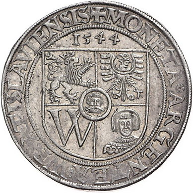 Los-Nummer: Auktion 51 - 1733 Altdeutsche Münzen und Medaillen Schlesien-Breslau, Stadt Taler 1544. Nach links schreitender Löwe / Vierfeldiges Wappen mit aufgelegtem Mittelschild, darüber Jahreszahl. Fr.u.S. 3413, Davenport 8993. Schöne Patina. Vorzüglich Schätzpreis: 2000,- Zuschlag: 1600,- |