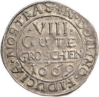 Los-Nummer: Auktion 51 - 44 Altdeutsche Münzen und Medaillen Anhalt, gemeinschaftlich Johann Georg II., Victor Amadeus, Wilhelm, Carl Wilhelm und Emanuel Lebrecht, 8 Gute Groschen 1669, Zerbst. Fürstenhut über neunfeldigem Wappen / Wert und Jahreszahl in vier Zeilen .VIII. - GUTE - GROSCHEN - 1669. Mann 213 D. Vorzüglich Schätzpreis: 1250,- Zuschlag: 1000,- |