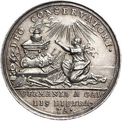 Los-Nummer: Auktion 51 - 2127 Haus Habsburg Haus Habsburg Leopold I. 1657-1705, Medaille 1704, unsigniert, von PH. Müller. Auf die Vertreibung der Franzosen aus Deutschland. Hand aus Wolken reicht neben Trophäen stehender Minerva einen Zweig / Kniende Germania huldigt vor Altar. Slg. Montenuovo 1178 , Slg. Julius 671, v. Loon IV, 402,1, Forster 728. 25,5 mm, 7,21 g. Stempelfehler auf der Vorderseite, vorzüglich Schätzpreis: 125,- Zuschlag: unverkauft |