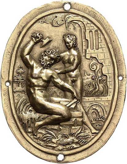 Los-Nummer: Auktion 51 - 2470 Medaillen Renaissance Deutschland Ovale vergoldete Plakette o.J. (17. Jahrhundert?). Vulkan sitzt vor Amboss, die Rechte mit erhobenem Hammer, neben ihm steht unbekleidete Venus. 55 x 42,5 mm. Vier Lochungen. Vorzüglich Schätzpreis: 300,- Zuschlag: unverkauft |