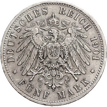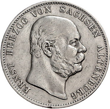 Los-Nummer: Auktion 51 - 2692 Münzen des Deutschen Kaiserreichs Sachsen-Altenburg Ernst 1893-1908, 5 Mark 1901 A. Jaeger 143. Sehr schön + Schätzpreis: 400,- Zuschlag: unverkauft |