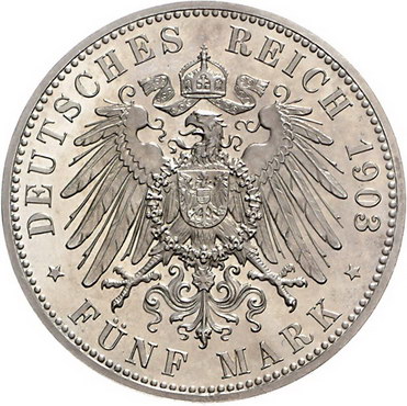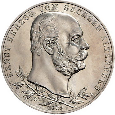 Los-Nummer: Auktion 51 - 2693 Münzen des Deutschen Kaiserreichs Sachsen-Altenburg Ernst 1893-1908, 5 Mark 1903 A. Regierungsjubiläum. Jaeger 144. Polierte Platte. Minimal berieben, fast Stempelglanz Schätzpreis: 300,- Zuschlag: unverkauft |