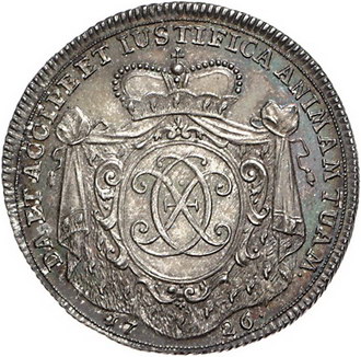 Los-Nummer: Auktion 51 - 1916 Altdeutsche Münzen und Medaillen Würzburg, Bistum Christoph Franz von Hutten 1724-1729, 1/2 Taler 1726. Helmschrott 601. Prachtexemplar. Schöne Patina. Fast Stempelglanz Schätzpreis: 1250,- Zuschlag: unverkauft |