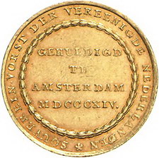 Los-Nummer: Auktion 51 - 3458 Ausländische Münzen und Medaillen Niederlande-Königreich Wilhelm I. 1815-1840, Goldmedaille 1814. Auf die Huldigung in Amsterdam. Büste nach links / Schrift in Kranz. Dirks Tf. 4/23. 23 mm, 8,82 g. GOLD. Fast vorzüglich Schätzpreis: 300,- Zuschlag: unverkauft |