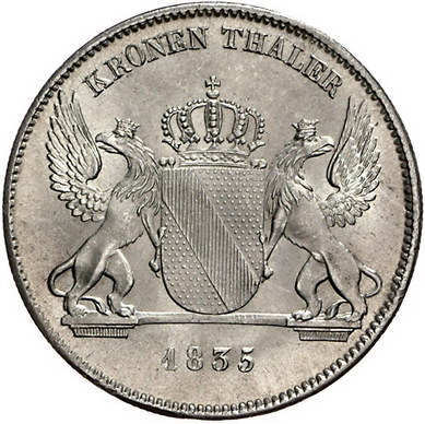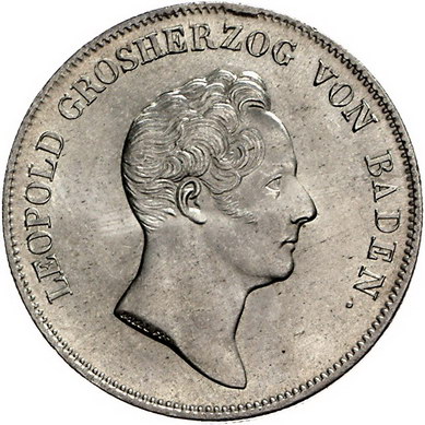 Los-Nummer: Auktion 51 - 73 Altdeutsche Münzen und Medaillen Baden-Durlach Leopold 1830-1852, Kronentaler 1835. Jaeger 47, Thun 19, AKS 82, Kahnt 23. Prachtexemplar. Prägebedingter Randfehler, Stempelglanz Schätzpreis: 750,- Zuschlag: 750,- |