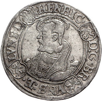Los-Nummer: Auktion 51 - 619 Altdeutsche Münzen und Medaillen Braunschweig-Wolfenbüttel Heinrich der Jüngere 1514-1568, Taler 1541, Riechenberg. Brustbild mit Mütze und Pelzkragen nach links / Wilder Mann hält Baumstamm. Welter 389, Davenport 9043. Vorzüglich Schätzpreis: 750,- Zuschlag: 1800,- |
