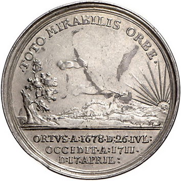 Los-Nummer: Auktion 51 - 2143 Haus Habsburg Haus Habsburg Josef I. 1705-1711, Medaille 1711. Auf seinen Tod. Brustbild nach rechts / Landschaft mit untergehender Sonne. Slg. Montenuovo 1321. 36 mm, 29,54 g. Sehr schön Schätzpreis: 100,- Zuschlag: unverkauft |