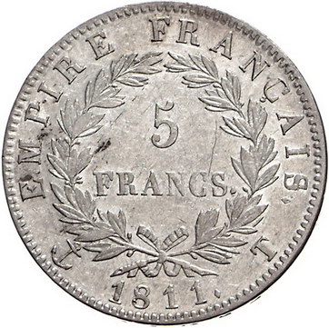 Los-Nummer: Auktion 51 - 3013 Ausländische Münzen und Medaillen Frankreich Napoleon I. 1804-1814, 1815, 5 Francs 1811 T, Nantes. Gadoury 584, Davenport 85. Vorzüglich Schätzpreis: 200,- Zuschlag: 180,- |