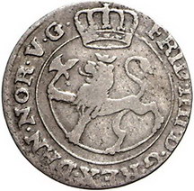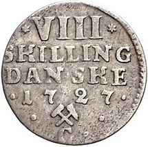 Los-Nummer: Auktion 51 - 3570 Ausländische Münzen und Medaillen Norwegen Frederik IV. 1699-1730, 8 Skilling 1727. Hede 17 B, ABH 38 B. Fast sehr schön Schätzpreis: 100,- Zuschlag: 125,- |