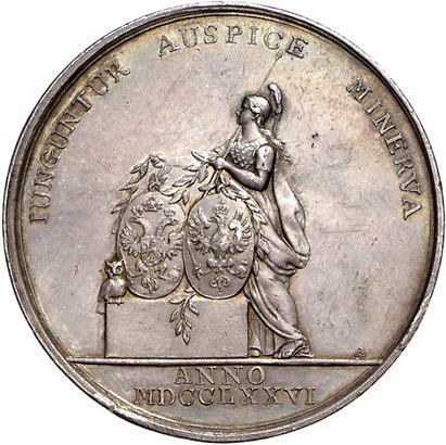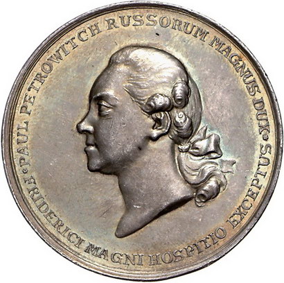 Los-Nummer: Auktion 51 - 3737 Ausländische Münzen und Medaillen Russland Katharina II. 1762-1796, Medaille 1776, von Abramson. Auf den Besuch des Großfürsten Paul von Russland in Berlin. Kopf des späteren Zaren nach links / Minerva schmückt Postament mit den Wappen von Preußen und Russland. Diakov 173.3 (R2) , Slg. Marienburg 3201, Slg. Henckel 1759, Hoffmann 164, Slg. Erbstein 2113 (Fe). 42 mm, 27,68 g. Schöne Patina. Vorzüglich Schätzpreis: 2500,- Zuschlag: unverkauft |