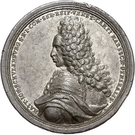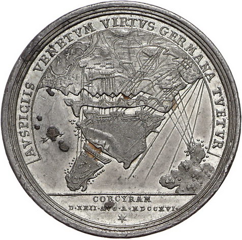 Los-Nummer: Auktion 51 - 3065 Ausländische Münzen und Medaillen Griechenland-Korfu Zinnmedaille 1716, von P.H. Müller und Vestner. Auf die erfolgreiche Verteidigung Korfus gegen die Türken durch Matthias Johann Graf von Schulenburg (*1661 Emden bei Magdeburg, +1747). Brustbild mit langer Allongeperücke nach links / Ansicht der Festung Korfu mit den Bahnen der feuernden Artillerie. Slg. Hauswaldt 1324 (Ag), Knyphausen 10104 , Slg. Julius 1273, Forster 800, Voltolina 1388. 48,5 mm. Mit Kupferstift. Sehr schön Schätzpreis: 100,- Zuschlag: 160,- |