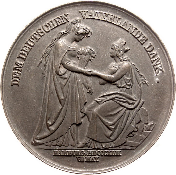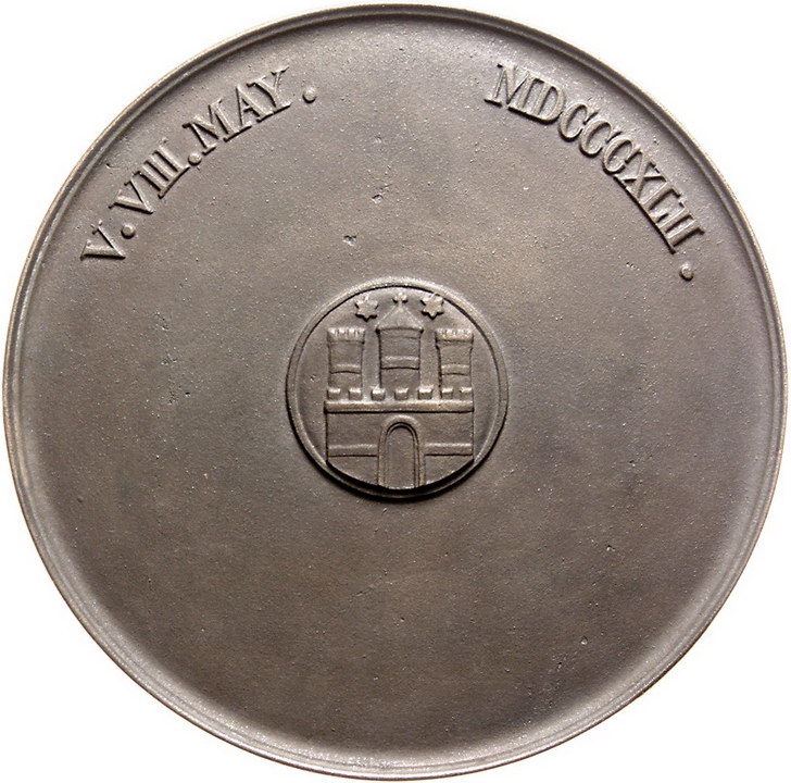 Los-Nummer: Auktion 51 - 883 Altdeutsche Münzen und Medaillen Hamburg-Stadt Großes Dankmedaillon der Stadt von 1843, gegossen aus dem Glockenmetall der beim großen Brand 1842 zerstörten Hauptkirche. Stehende Germania überreicht sitzender Hammonia ein Füllhorn / Medaillon mit Stadtwappen. Gaedechens 2082. 163 mm. Vorzüglich Schätzpreis: 250,- Zuschlag: 330,- |