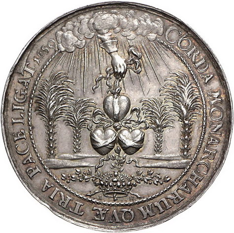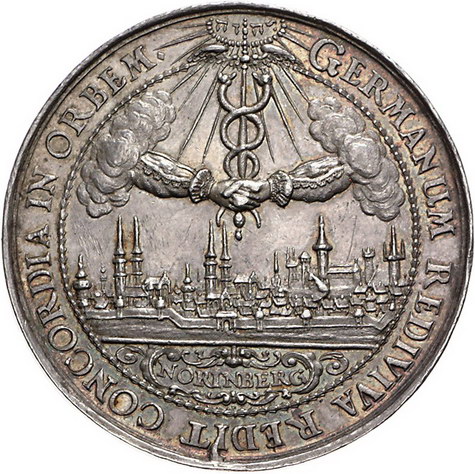 Los-Nummer: Auktion 51 - 1282 Altdeutsche Münzen und Medaillen Nürnberg, Stadt Medaillen, Medaille 1650, von Johann Höhn. Auf den Vollzug des Westfälischen Friedens. Zwei Arme aus Wolken halten Merkurstab über Stadtansicht / Arm aus Wolken hält drei Herzen über Krone in Palmlandschaft. Slg. Erlanger 1041 , Dethlefs/Ordelheide 140, PiN 146. 48,8 mm, 29,60 g. Schöne Patina. Vorzüglich Schätzpreis: 750,- Zuschlag: unverkauft |