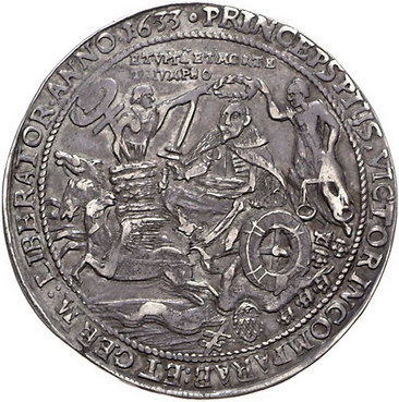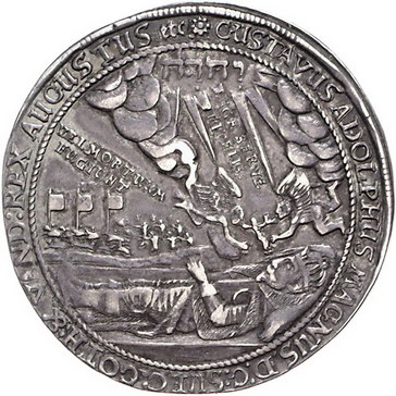 Los-Nummer: Auktion 51 - 1387 Altdeutsche Münzen und Medaillen Pommern-unter schwedischer Besetzung Gustav II. Adolf 1631-1632, 1/2 Taler 1633, Wolgast. Auf die Überführung seiner Gebeine nach Schweden. Gustav Adolf liegt aufgebahrt, seine Seele wird von zwei Engeln zum strahlenden Namen Jehovas getragen, im Hintergrund Schlachtfeld / Der König sitzt in einem von drei Pegasi gezogenen Triumphwagen und wird von Religio und Justitia bekränzt. S.B. 14, Hildebrand I, S. 193, 189. Sehr schön - vorzüglich Schätzpreis: 900,- Zuschlag: unverkauft |