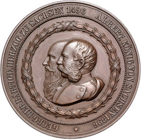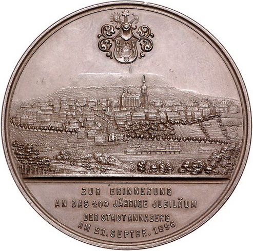 Los-Nummer: Auktion 51 - 1598 Altdeutsche Münzen und Medaillen Sachsen-Annaberg, Stadt Bronzemedaille 1896. Auf die 400jährige Jubiläum der Stadt. Die Brustbilder Georg des Bärtigen und König Alberts im Lorbeerkranz nach links / Ansicht von Annaberg, darüber Stadtwappen. Slg. Merseburger - , Müseler 56.2.3.33 a. 50 mm. Vorzüglich Schätzpreis: 150,- Zuschlag: unverkauft |