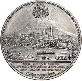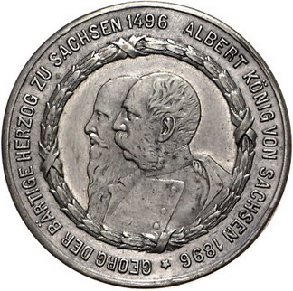 Los-Nummer: Auktion 51 - 1599 Altdeutsche Münzen und Medaillen Sachsen-Annaberg, Stadt Versilberte Bronzemedaille 1896. Auf das 400jährige Jubiläum der Stadt Annaberg. Die Brustbilder Georg des Bärtigen und Alberts im Lorbeerkranz nach links / Ansicht von Annaberg, darüber Stadtwappen. Müseler 56.2.3.34 (Silber). 33,3 mm. Sehr schön + Schätzpreis: 75,- Zuschlag: 130,- |