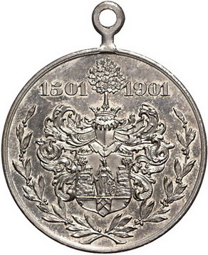 Los-Nummer: Auktion 51 - 1600 Altdeutsche Münzen und Medaillen Sachsen-Buchholz, Stadt Versilberte Bronzemedaille 1901. Auf das 400jährige Stadtjubiläum. Stadtansicht / Wappen. 30 mm. Originalöse. Vorzüglich - Stempelglanz Schätzpreis: 75,- Zuschlag: 80,- |