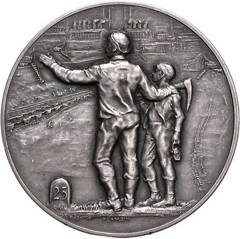 Los-Nummer: Auktion 51 - 1610 Altdeutsche Münzen und Medaillen Sachsen-Dresden, Stadt Medaillen von Friedrich Wilhelm Hörnlein, Medaille o.J. (1926) des Deutschen Braunkohlen-Industrie-Vereins für 25 Jahre treue Arbeit. Bergmann mit Lehrling deutet auf Braunkohlentagebau, im Hintergrund Elektrizitätswerk / Schrift über Eisen und Schlägel. Arnold 200, Müseler 15.3.13. 50,5 mm, 38,3 g. Mattiert. Vorzüglich Schätzpreis: 75,- Zuschlag: 80,- |