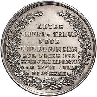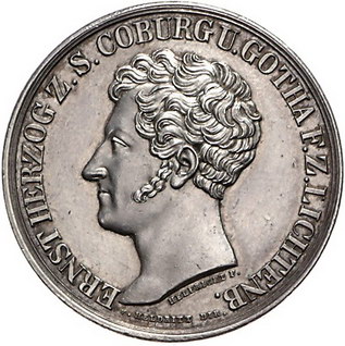 Los-Nummer: Auktion 51 - 1661 Altdeutsche Münzen und Medaillen Sachsen-Coburg-Gotha Ernst I. 1826-1844, Medaille 1832, von Helfricht, Wardein von Heldritt. Auf die 25-Jahrfeier seiner Huldigung durch die Coburger Bürgerschaft in Gotha. Kopf nach links / Acht Zeilen Schrift in Eichenkranz. Slg. Merseburger 3292. 32,5 mm, 21,46 g. Vorzüglich Schätzpreis: 75,- Zuschlag: 110,- |