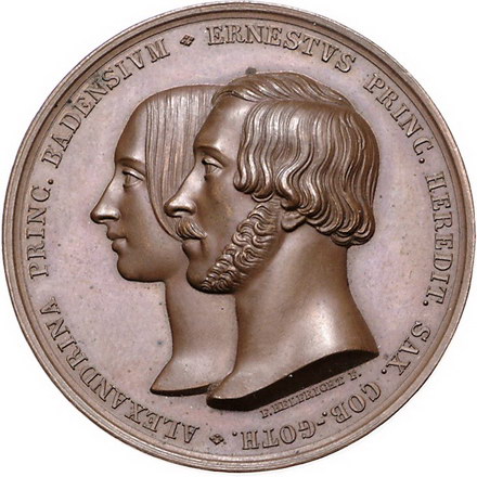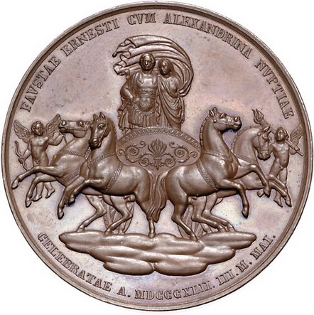 Los-Nummer: Auktion 51 - 1665 Altdeutsche Münzen und Medaillen Sachsen-Coburg-Gotha Ernst II. 1844-1893, Bronzemedaille 1842, von Helfricht. Auf seine Vermählung mit Prinzessin Alexandrina von Baden. Beider Büsten nach links / Das Brautpaar auf einem von vier Pferden gezogenen und von Amor und Hymen flankierten Muschelwagen. Slg. Merseburger 3320 (Silber) , Wielandt/Zeitz 278. 45 mm. Vorzüglich + Schätzpreis: 100,- Zuschlag: 160,- |
