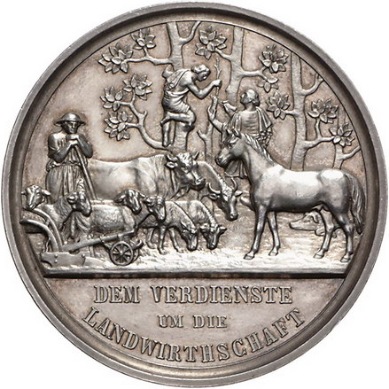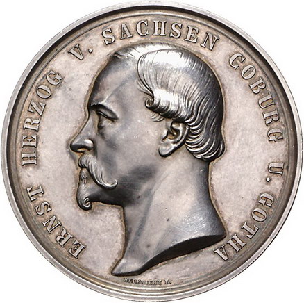 Los-Nummer: Auktion 51 - 1669 Altdeutsche Münzen und Medaillen Sachsen-Coburg-Gotha Ernst II. 1844-1893, Medaille o.J., von Helfricht. Verliehen ab 1872. Für Verdienste um die Landwirtschaft. Kopf nach links / Tiergruppe mit Schäfer und Gärtner, der einen Jüngling im Pfropfen eines Baumes unterweist. Slg. Merseburger 3329 , Slg. Kozinowski 1843. 45 mm, 41,4 g. Vorzüglich - Stempelglanz Schätzpreis: 175,- Zuschlag: 280,- |