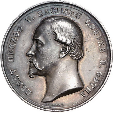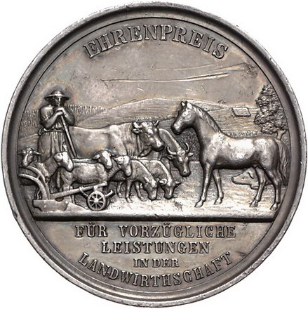 Los-Nummer: Auktion 51 - 1670 Altdeutsche Münzen und Medaillen Sachsen-Coburg-Gotha Ernst II. 1844-1893, Medaille o.J., von Helfricht. Verliehen ab 1880. Für Verdienste um die Landwirtschaft. Kopf nach links / Tiergruppe mit Schäfer in Landschaft. Slg. Merseburger - , Slg. Kozinowski 1844 (Bronze). 45 mm, 42,70 g. Kratzer, sehr schön Schätzpreis: 75,- Zuschlag: 110,- |